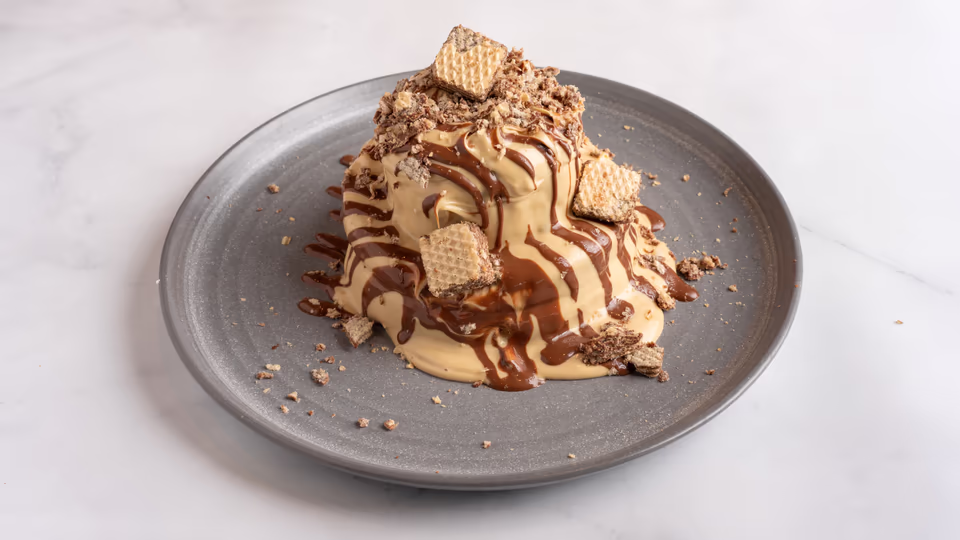 שני פנקייקים בעיטור רוטב לואקר וופל לואקר | הרטבים מוגשים מעל הפנקייק