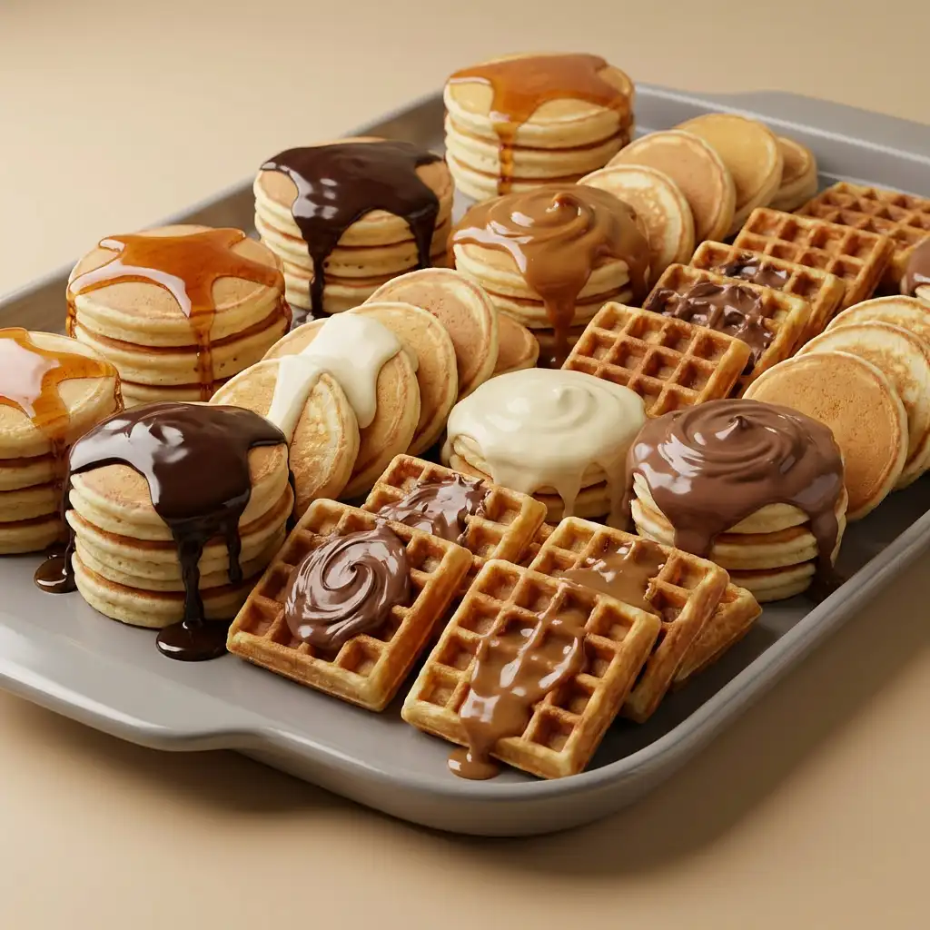 מגשי פנקייק וופל מיקס: 35 עיגולי פנקייק מקוריים, 35 יחידות וופל בלגי, בתוספת סירופ בטעם מייפל, סירופ בטעם שוקולד, סירופ ריבת חלב, רוטב אגוזי לוז עם קקאו, ממרח שוקולד לבן. ניתן לבחור בין פנקייק רגיל לפנקייק ללא גלוטן/טבעוני בכל כמות. כשרות: [יש לעדכן כשרות]