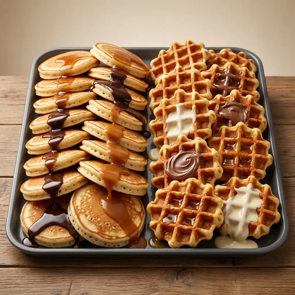 מגשי פנקייק וופל מיקס: 20 עיגולי פנקייק מקוריים, 20 יחידות וופל בלגי, בתוספת סירופ בטעם מייפל, סירופ בטעם שוקולד, סירופ ריבת חלב, רוטב אגוזי לוז עם קקאו. ניתן לבחור בין פנקייק רגיל לפנקייק ללא גלוטן/טבעוני בכל כמות. כשרות: [יש לעדכן כשרות]